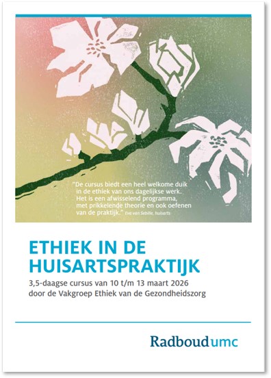 In deze cursus staan we stil bij de morele dimensie van uw handelen als huisarts. We bespreken, verhelderen en analyseren gezamenlijk de morele problemen die u als huisarts tegenkomt, en we plaatsen deze problemen in een ruimere ethische context. U ontwikkelt een grotere morele gevoeligheid en vergroot uw inzicht in de morele kwaliteit van uw handelen en dat komt de (morele) kwaliteit van uw zorg ten goede. Vertrekpunt zijn de morele problemen en vragen die u in uw dagelijks werk tegenkomt.